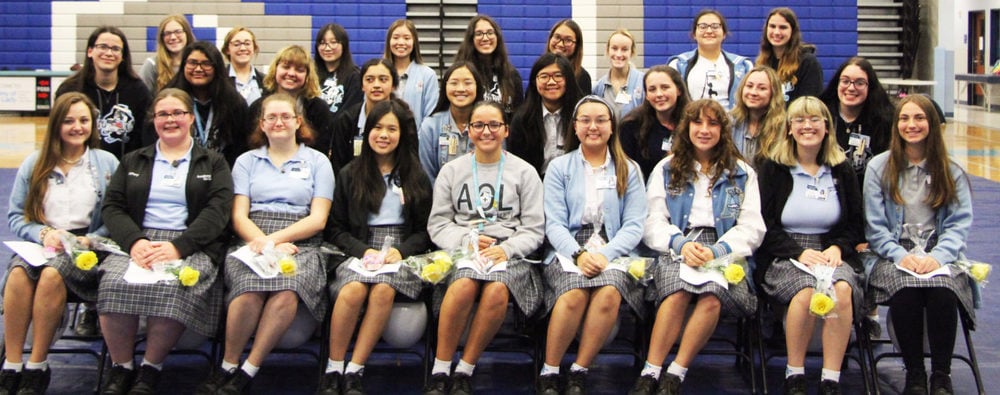 New members of the National Honor Society are, back row, left to right: juniors Abigail Melling and Ally Price, sophomore Amber Nguyen, senior Ariana Nguyen, sophomores Carissa Shirk and Christine Pham, senior Emily Mailhos, junior Emily Lubag and sophomore Emily Eschette. Middle row: sophomores Emma Palmisano and Gracelyn Barrios, senior Hope Hebert, junior Janette Pina, senior Julia Mai, sophomores Kacey Nguyen and Katie Harlow, senior Kaylin Bair and sophomore Kyli Rodriguez. Front row: senior Mallory Carubba, sophomores Marlyce Perry, Megan Davis, Milea Tran and Mindy Harlow, senior Natalie Bui, sophomores Olivia St. Germain and Paris Labadie and senior Rachelle Sancho.