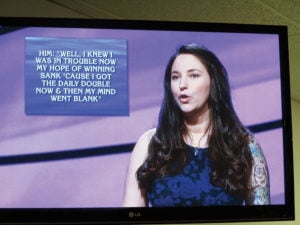 “It was a crazy experience,” she said. “Jeopardy” tapes one week of shows in a day. “You get on the lot by 8:30 a.m.; you have to have your hair done (takes time since she has long hair) and bring your own wardrobe. … They put you in the green room (with about 20 other people waiting for selection at random), and you sign releases. … Previous champions show up and tell you about their experience.”