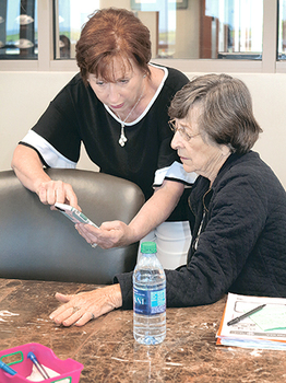 During a recent class, participants Lorraine Genovese and Margie Berry accessed their phones as Marinello used her phone hooked up to a large screen so they could see what she was exploring.