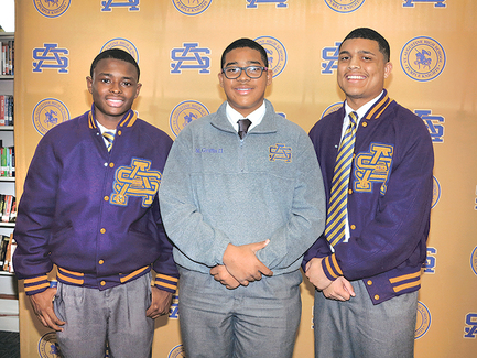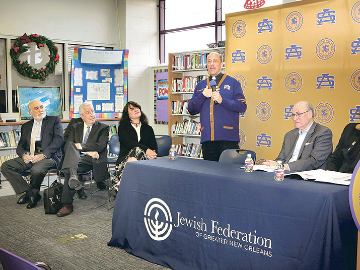 Representatives from the Jewish Federation of Greater New Orleans gathered recently inside St. Augustine’s library to award scholarships of $1,000 each to three winners of a federation-sponsored essay competition: seniors Marc Barnes Jr. and Bernard Johnson, sophomore Michael Griffin II.